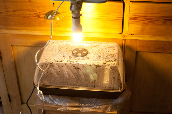 It’s just a regular 11Watt energy saving light bulb in the light fitting – they are ideal for young seedlings as they are cheap to run and don’t produce too much heat. I’ll probably leave the light on for about 16 hours a day to keep the seedlings happy.