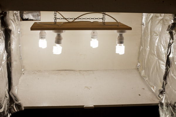 So fully tested it’s time to mount the lights inside the cupboard. I’ll probably experiment with using both these regular domestic CFL bulbs (x4) and my old 125 Nurturlite so I need a flexible hanging system to allow me to easily swap out the lights. After a quick rummage in the shed I found a length of chain and some sturdy metal hooks. I simply screwed two hooks on to the ‘ceiling’ of the cupboard and a couple to the top of the light rig. I then run the chain in a U shape through all of the hooks to hang the rig. The beauty of using this chain system is that it is very quick and easy to adjust the height of the lights or remove the whole rig if I want to put my Nuture light in there at some stage.