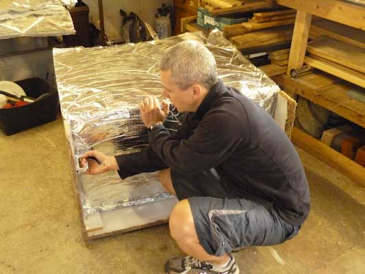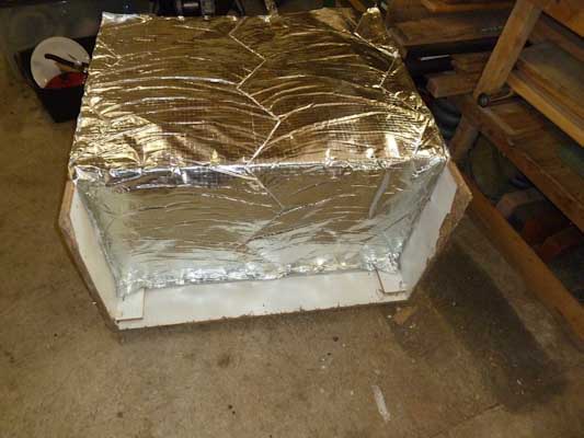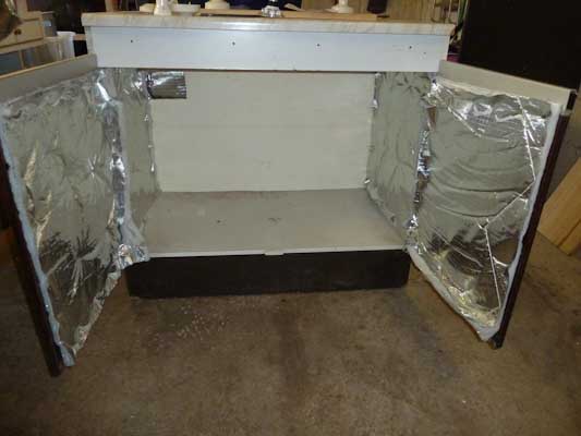 To help keep growing temperatures up high i decided to use some old loft insulation to insulate the base and back of the cupboard. I forget the name of the insulation but it is ultra thin (about 2cm) and made up of about 10 layers of aluminum and fiber glass webbing stitched together.
